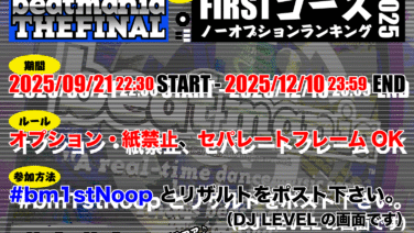 X(Twitter)企画 【5鍵THE FINAL】FIRSTコース・ノーオプションランキング2025 期間2025/09/21 22:30 - 2025/12/10 23:59ルールオプション・紙禁止、セパレートフレームOK参加方法beatmania THE FINALのEXPERT MODE「FIRSTコース」をプレイし、X(Twitte... 2025.09.22 X(Twitter)企画イベント